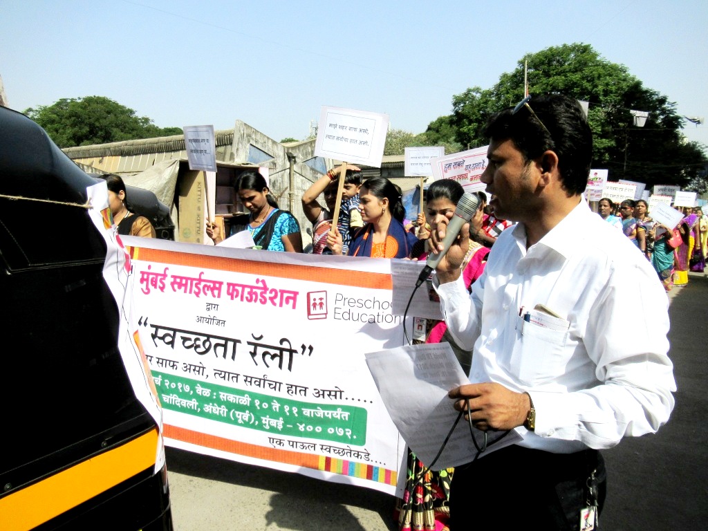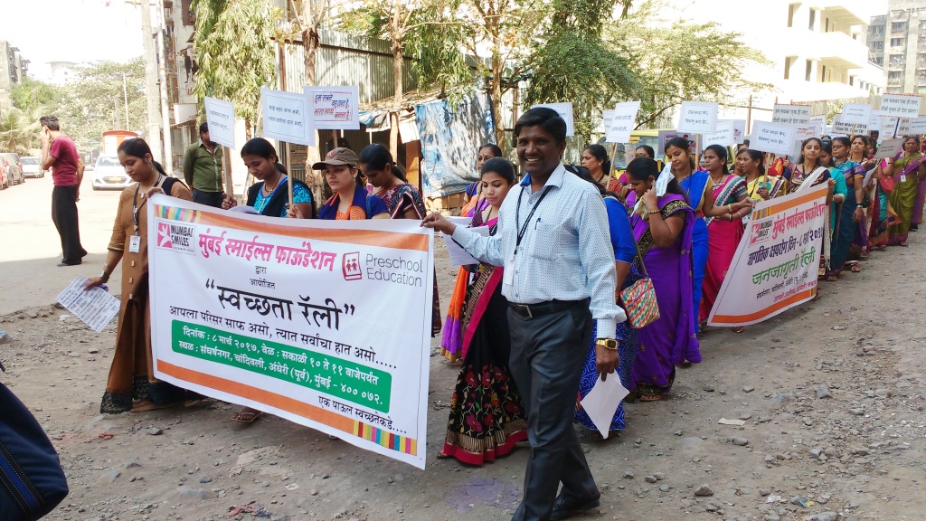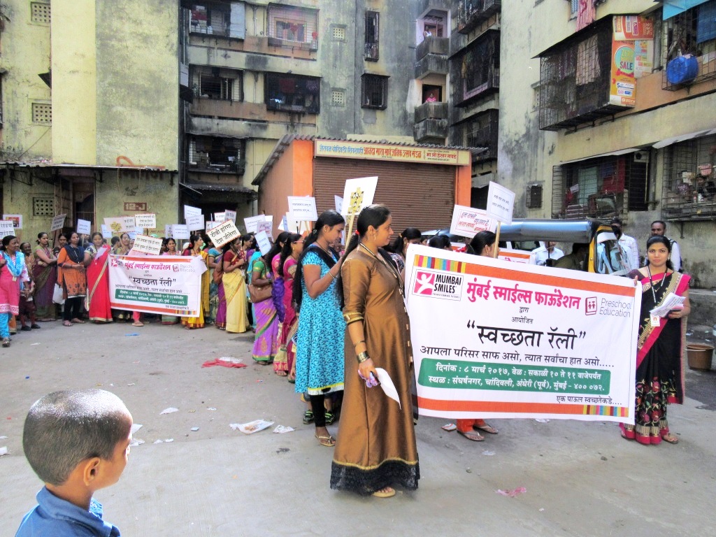 The Cleanliness Rally was conducted in one of our project communities called Sangharshnagar, an area amidst the luxurious residential towers in Powai, with the objective to sensitise the citizens about importance of cleanliness for good health and environment, especially to try and eradicate the system of open defecation, since that is the most unhygienic practices which is extremely dominant in slum communities.