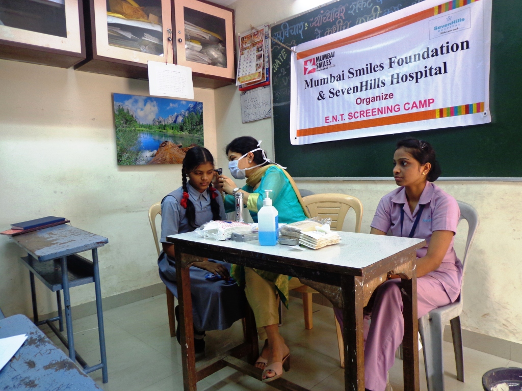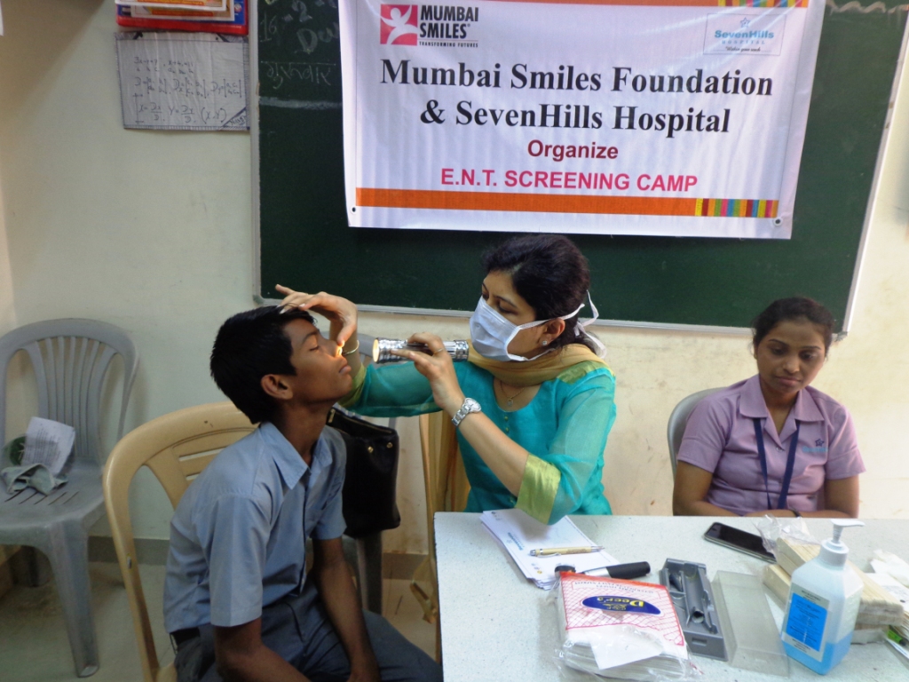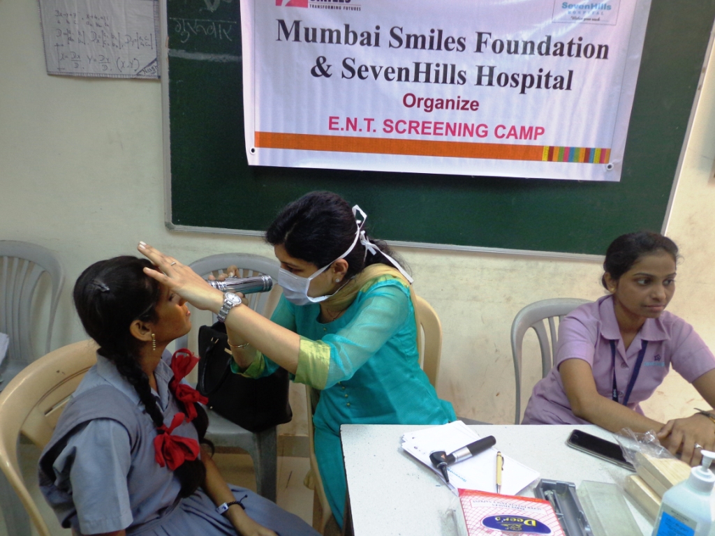 The latest health camp conducted was for the students of Powai Marathi School (one of our partner schools) in IIT, Powai area (where our office is also situated), and it was an ENT (Ear-Nose-Throat) camp, in collaboration with Seven Hills Hospital, who graciously helped us by way of doctors as well as medical equipment. The camp held benefitted 85 students of the school of which 6 were detected with some health issues.