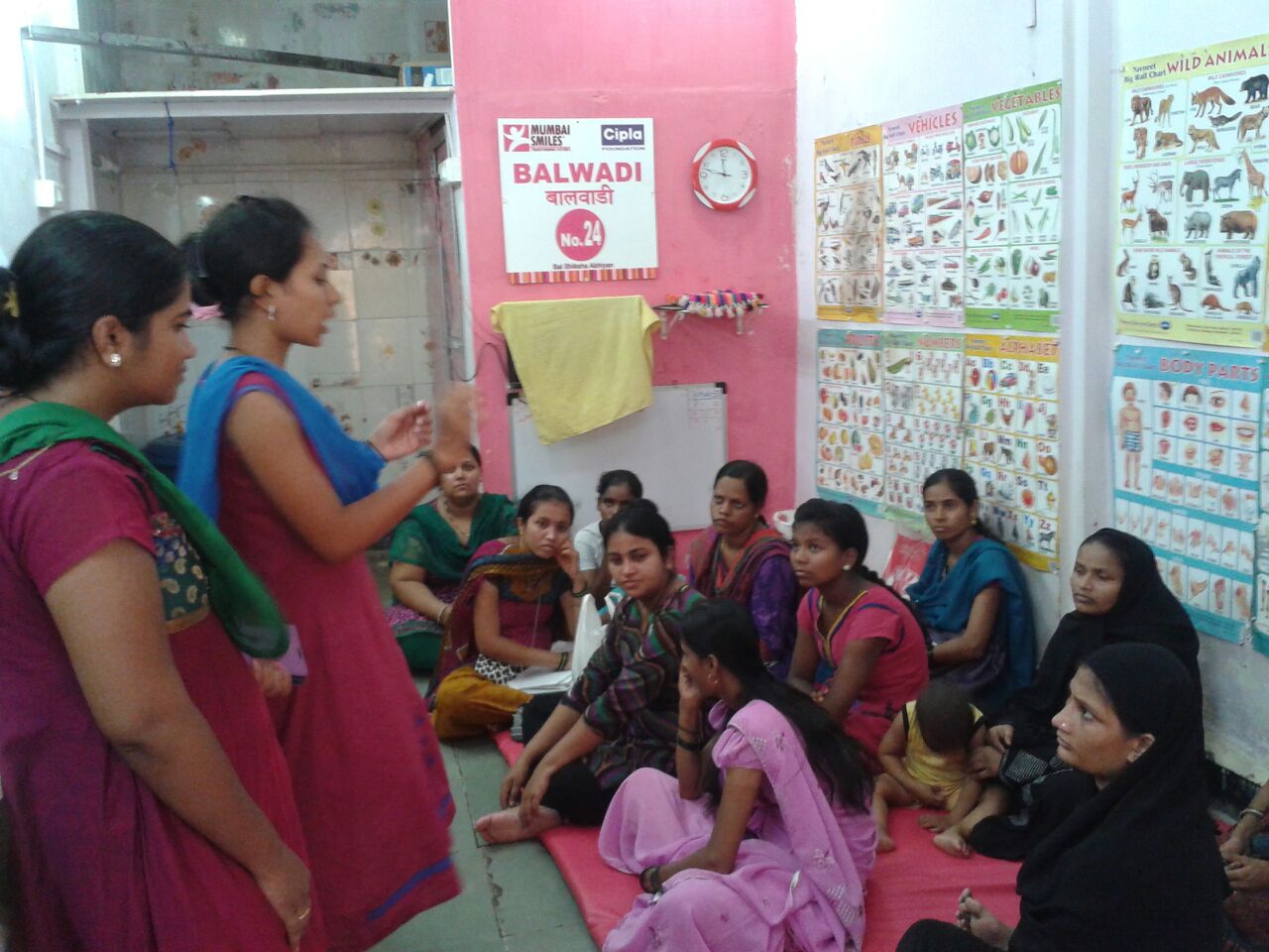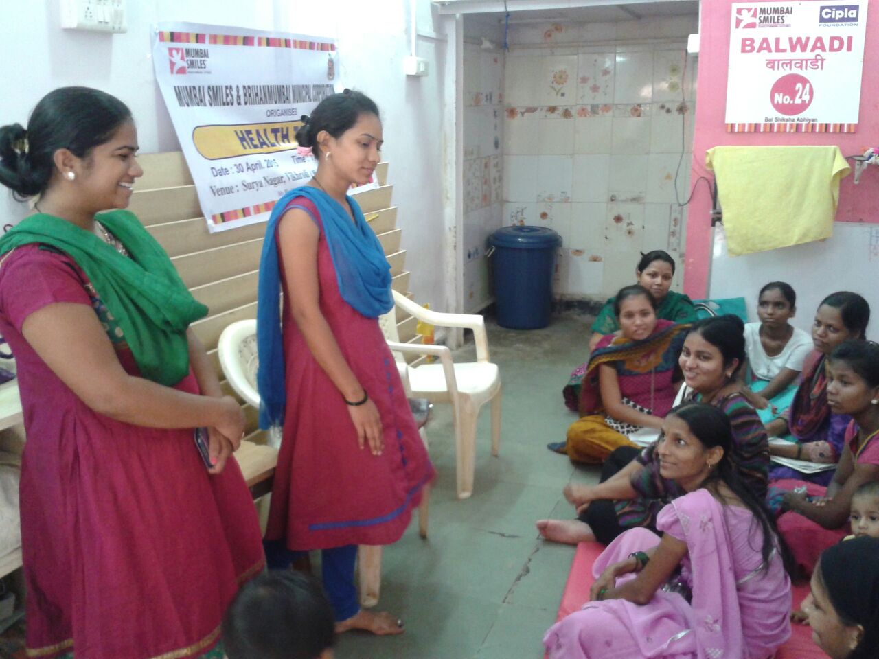 Mumbai Smiles is one of the partner organizations and thus enables mMitra to reach out to potential beneficiaries. Recently, Mumbai Smiles, in partnership with BMC, organized the first ‘Health Talk’ on Post-natal Care & Immunization in Balwadi No 24 at Suryanagar, Vikhroli on April 30, 2015. Ms. Smita Gawde, Program Officer, mMitra, Mumbai Smiles briefly spoke about Mumbai Smiles work in the areas of Health, Education & Livelihoods. A team of health care professionals from BMC was present along with Mumbai Smiles Program staff. Public Health Nurse, ANM spoke about need for regular immunization, importance of Breast Feeding and nutrition. Doubts of nursing mothers regarding immunization & breast feeding were also cleared.