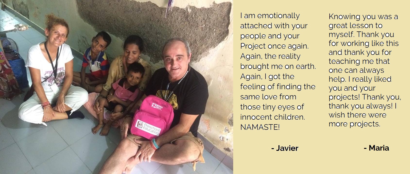 We have been very fortunate to have some of the most amazing people in the world to be our donors, members and supporters, who have stuck by us our mission for years and continue to support us in our anti poverty projects. Today we present to you the encouraging and kind words of our supporters, Javier and Maria, a couple from Spain, who visited our projects and spent time interacting with our citizens in the community and students in preschool centre: