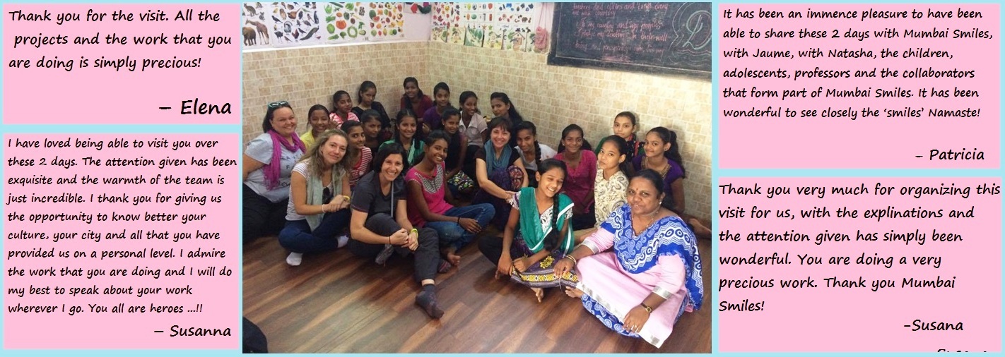 Each year, we get a number of visitors from across the world who have read about our Founder & President, Jaume Sanllorente and Mumbai Smiles and express their wish to see our work first hand. Recently, we had a set of four lovely ladies who visited our various projects and here are their comments: