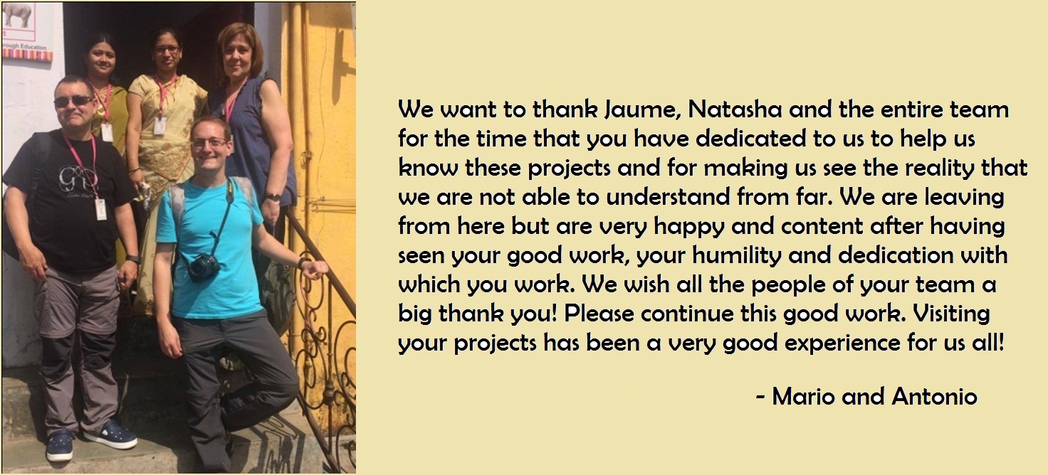 Recently we had four visitors from Barcelona, Mario and Antonio, both of whom are our regular donors, along with two more of their friends, who spent two days visiting the projects of Mumbai Smiles and interacting with our beneficiaries. The interesting bit about this visit is that Mario is a student of our Founder and President, Mr. Jaume Sanllorent in the University of Barcelona (UB), where Jaume is a Guest Professor, teaching the batch of Leadership & Personality Development, MBA.