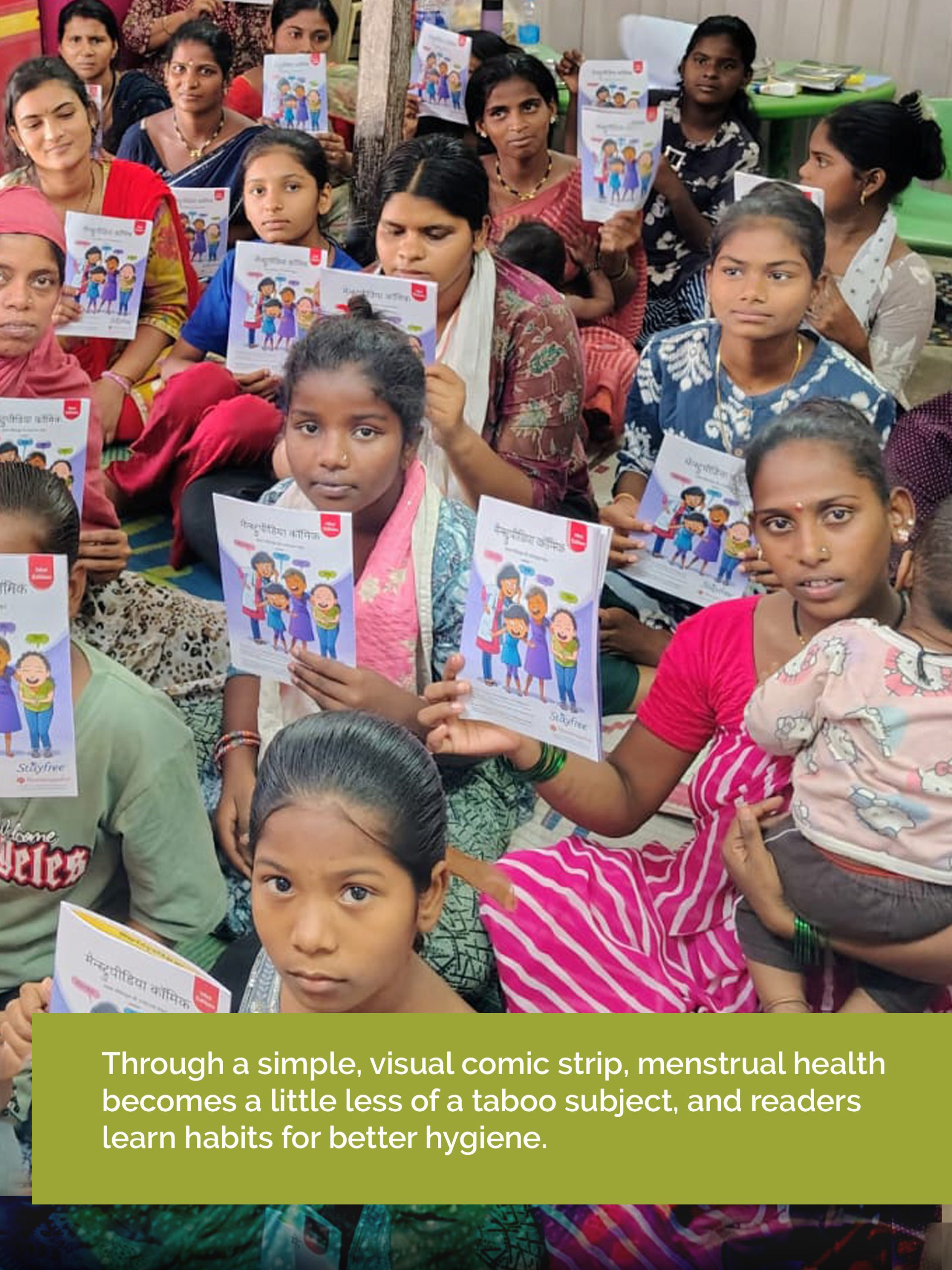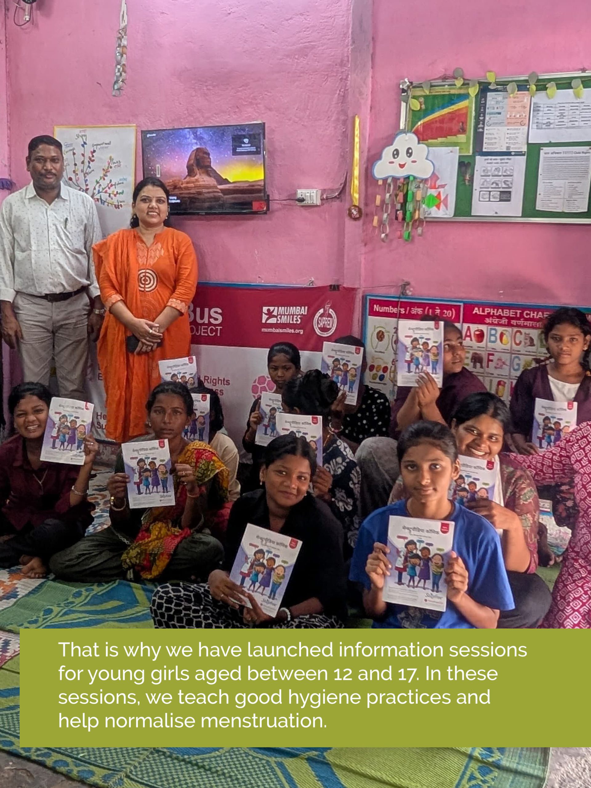 In collaboration with the Pagaria Foundation and a group of students from the Tata Institute of Social Sciences(TISS), we have launched a series of informational sessions for the girls of Chheda Nagar. Using a comic book and various supporting audiovisual materials, we explain what menstruation entails—its characteristics and the effects it has on women. Above all, we highlight the recommended practices and habits for proper personal hygiene. Throughout this process, we create a safe and comfortable space where the women and girls of the community can speak openly about menstruation, thereby alleviating their doubts and reducing the social stigma currently associated with it.