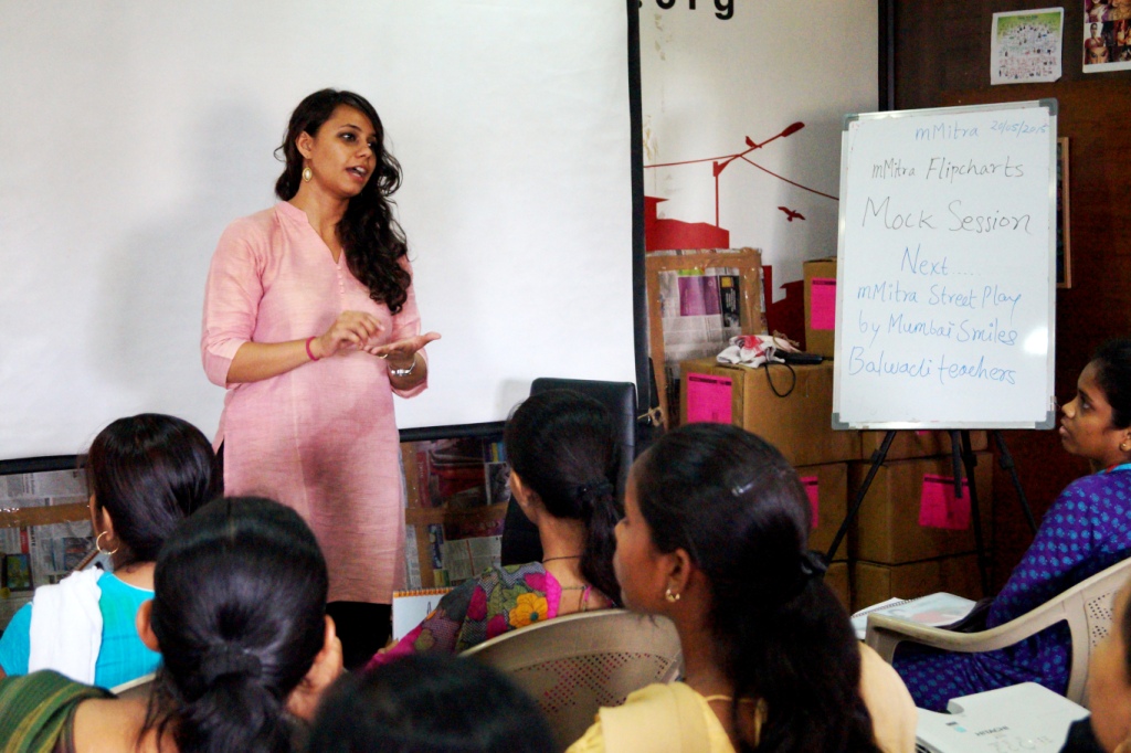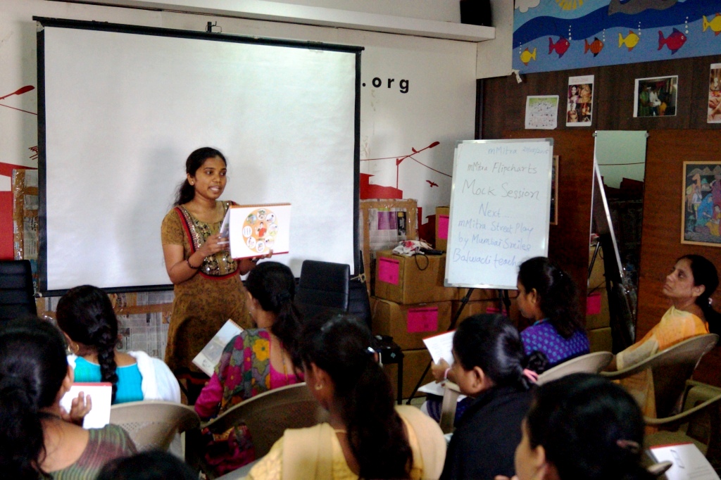 As a part of this project Armman foundation organizes regular training programs for Field supervisors of all the partner NGOs. This training program was held on 20th of May at the Mumbai Smiles office. More than 30 members attended the training program from various partner NGOs. The program was organized with the objective of reiterating the mMitra project’s concept and to acquaint the Field Supervisors with the mMitra communication material. The revised mMitra flip chart was explained and discussed among the Field Supervisors so that they can share the information with the Arogya Sakhis who closely work with the beneficiaries. The program also ensured to gather the experiences of the Field Coordinators while working with the beneficiaries. The training also touched upon the topic of Offline Data entry and coordinating work with Sakhis. In order to make the training more comprehensive a Street Play was performed by the Mumbai Smiles Balwadi teachers. The play highlighted the commonly faced issues by women in the communities of Mumbai. The play was highly appreciated for its delivery and content.