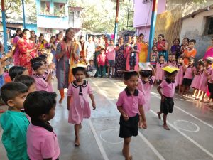 The 2-3 hours sports activities were planned area and preschool wise, on open grounds in the vicinity of the slums where children lived. Our tiny tots were grouped into teams and participated in a variety of individual and team sports activities and games – basketball, walk balancing a book, bottle game, rabbit jump, frog Jump etc. Parents cheered for their children and applauded the winners who were felicitated at the end of the event.