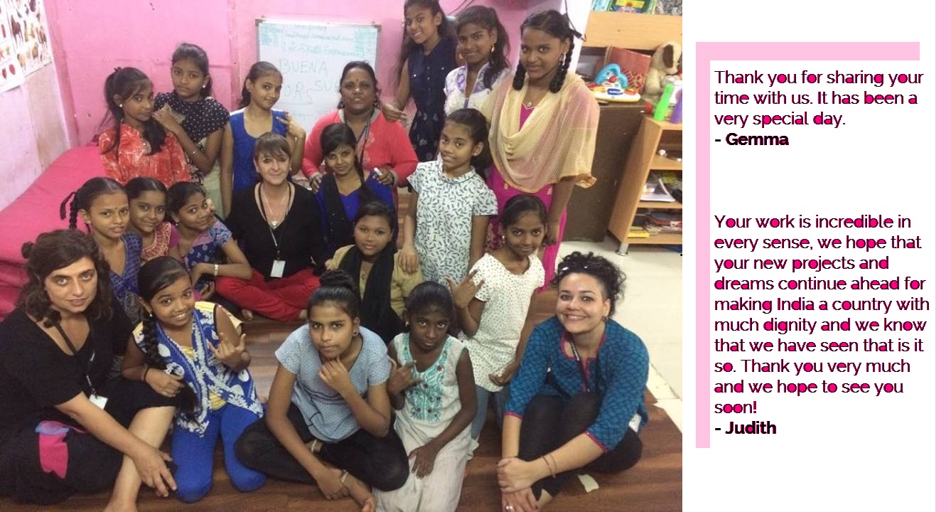 The Responsive Action project team was happy to receive two lovely ladies from Spain, who on their trip to Mumbai, decided to stop by at our office and spend a day visiting our projects. Gemma and Judith enjoyed their day interacting with our tiny students at Preschool Education centres and then exchanging dialogues with the girls of Life Skills Empowerment project. Having spent a day with the team and beneficiaries of Mumbai Smiles, both Gemma and Judith seemed happy to have decided to stop by at Mumbai Smiles and this is what they had to say about us: